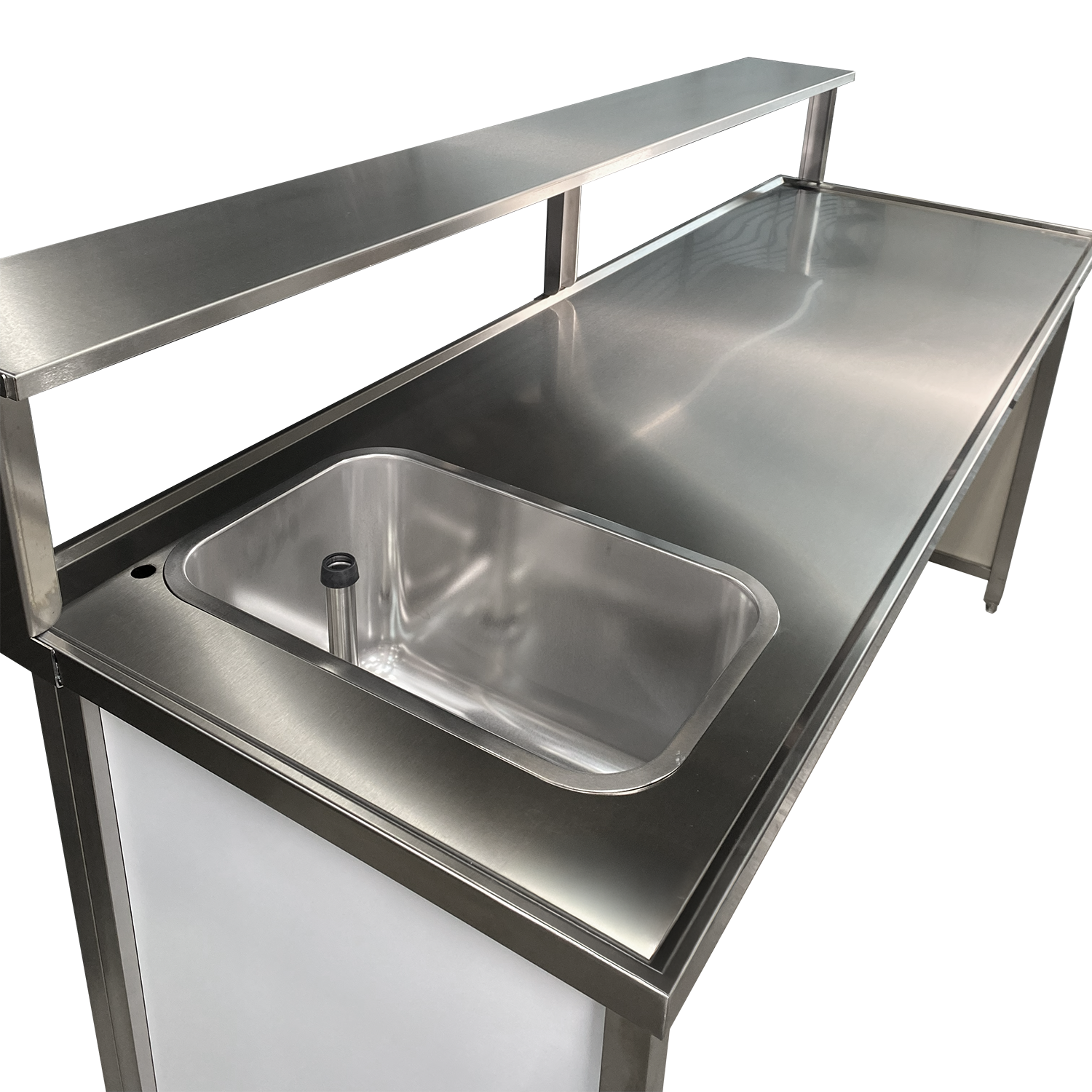 Für mobile Arbeitsplätze mit Wasseranschluss steht die Theke zudem in einer Variante mit integriertem Spülbecken zur Verfügung. Das Edelstahl-Spülbecken mit den Maßen 500 × 300 mm wird inklusive Spülwannenablaufventil und Standrohr geliefert. Zusätzlich wird eine 23 mm Lochbohrung für einen Kaltwasserstandhahn angefertigt. Diese Version eignet sich besonders für Foodtruck-Betriebe, Eventgastronomie oder alle Einsatzbereiche, in denen eine schnelle und hygienische Reinigung von Gläsern, Geschirr oder Arbeitsutensilien erforderlich ist.