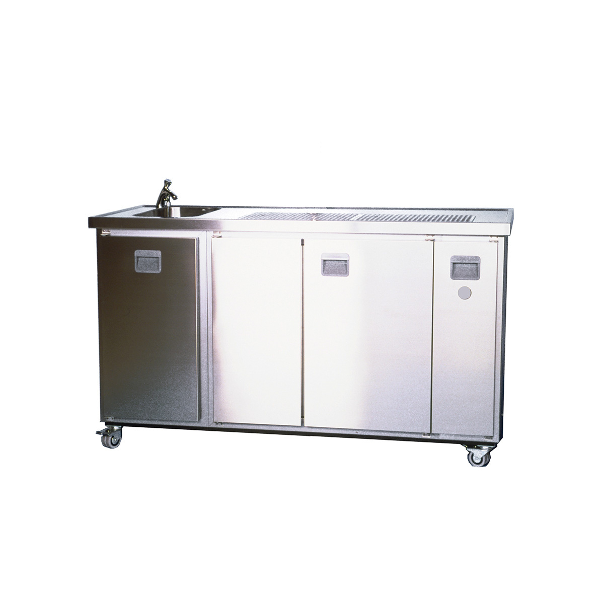 Unser Mobiltheke MT4 bieten eine Raum- und Durchlaufkühlung. Die Abdeckung ist in Edelstahl gehalten und verfügt über einen Wulstrand und tiefgezogenem Tropfblech. Die Türfronten und Blenden sind ebenfalls in Edestahl und weisen eine Anti-Fingerprint-Beschichtung auf. Der Boden besteht aus spezialbeschichteten Stahlblech inklusive Fassstoßkante. Durch den stabilen Rahmen mit 4 Lenkrollen (2 davon feststellbar) ist die Theke mobil einsetzbar.