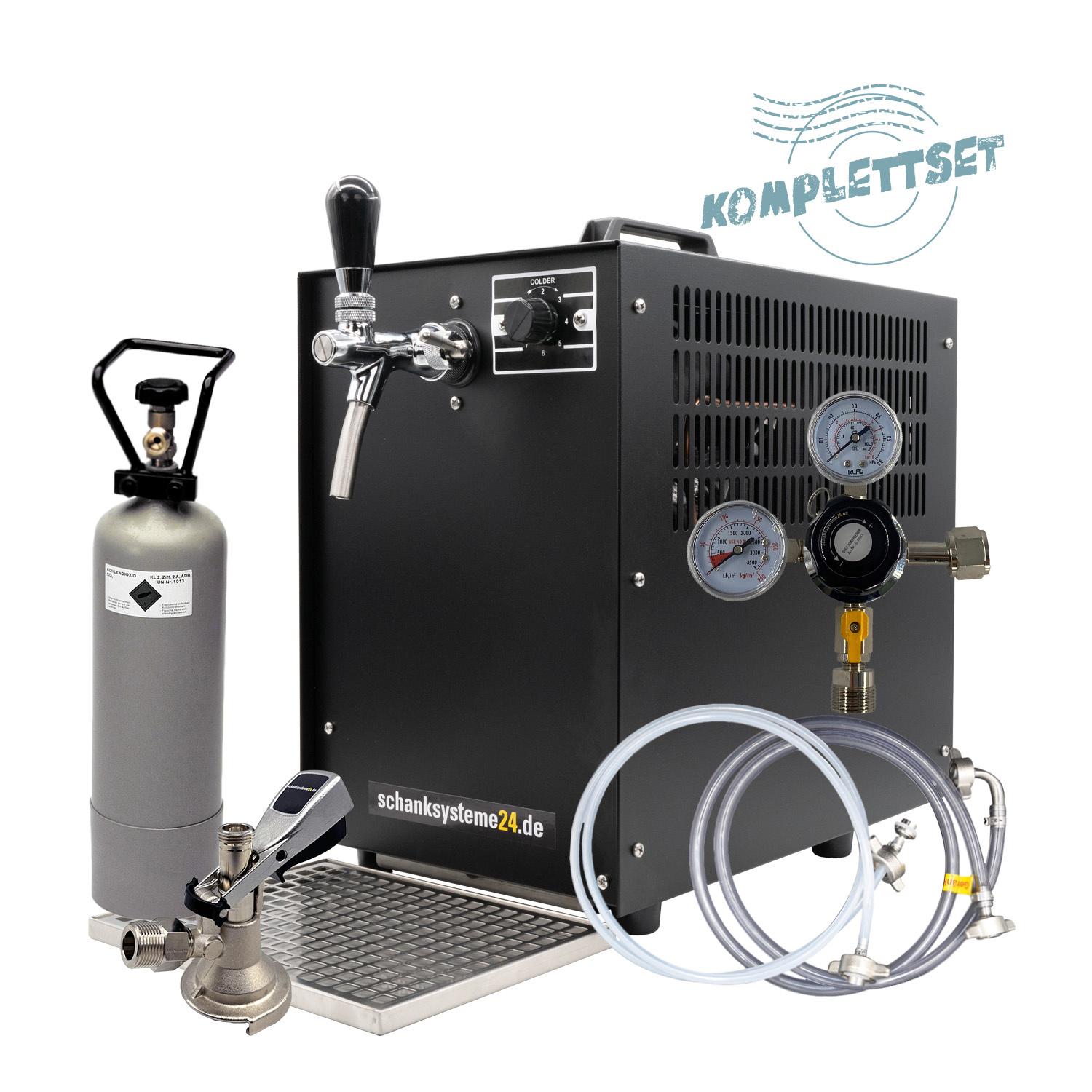 Bei unserem Komplettset Trockenkühler TE-60-1-Black Edition ist das passende Zubehör bereits im Lieferumfang enthalten, so können Sie nichts vergessen! Wenn die Anlage bei Ihnen ankommt, einfach die mitgelieferten Teile montieren, das Fass und die CO2 Flasche anschließen und loszapfen.