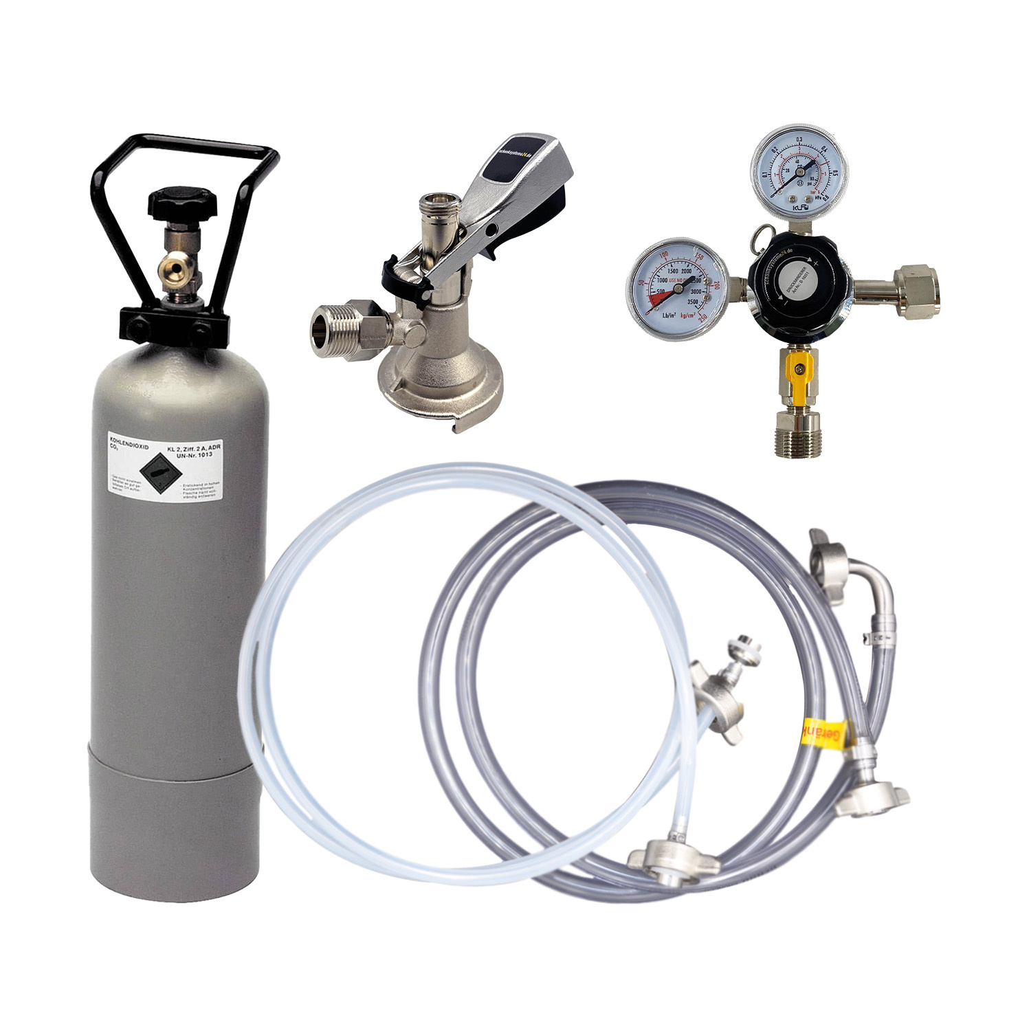 Verwenden Sie dieses Set für alle 1-leitigen Zapfanlagen und alle gängigen CO2-Flaschengrößen von 0,5 bis 10 kg. Die in diesem Set enthaltene 2,0 kg Flasche reicht für etwa 350 Litern Bier.